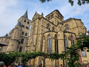 In Trier angekommen, machten wir uns auf die Suche unseres Hotels „Holiday Inn Express“, das etwas ausserhalb des Stadtzentrums liegt. Wir bezogen unser Zimmer und fuhren mit dem Velo ins Stadtzentrum mit den berühmten Sehenswürdigkeiten wie Porta Nigra, dem Dom, Liebfrauenkirche, dem alten Markt mit seinen alten Häuserzeilen. In der Weinstube Kesselstatt fanden wir eine Platz und genossen ein leckeres Znacht: Spargelsalat mit Erdbeeren und Bratkartoffeln. Für uns ist die eine ungewohnte Zusammensetzung, doch vor allem die Kombination Spargeln mit Erdbeeren an einer leicht süsslichen Senfsalatsauce hat uns überzeugt. Von unserem Platz hatten wir direkte Sicht auf den Dom.