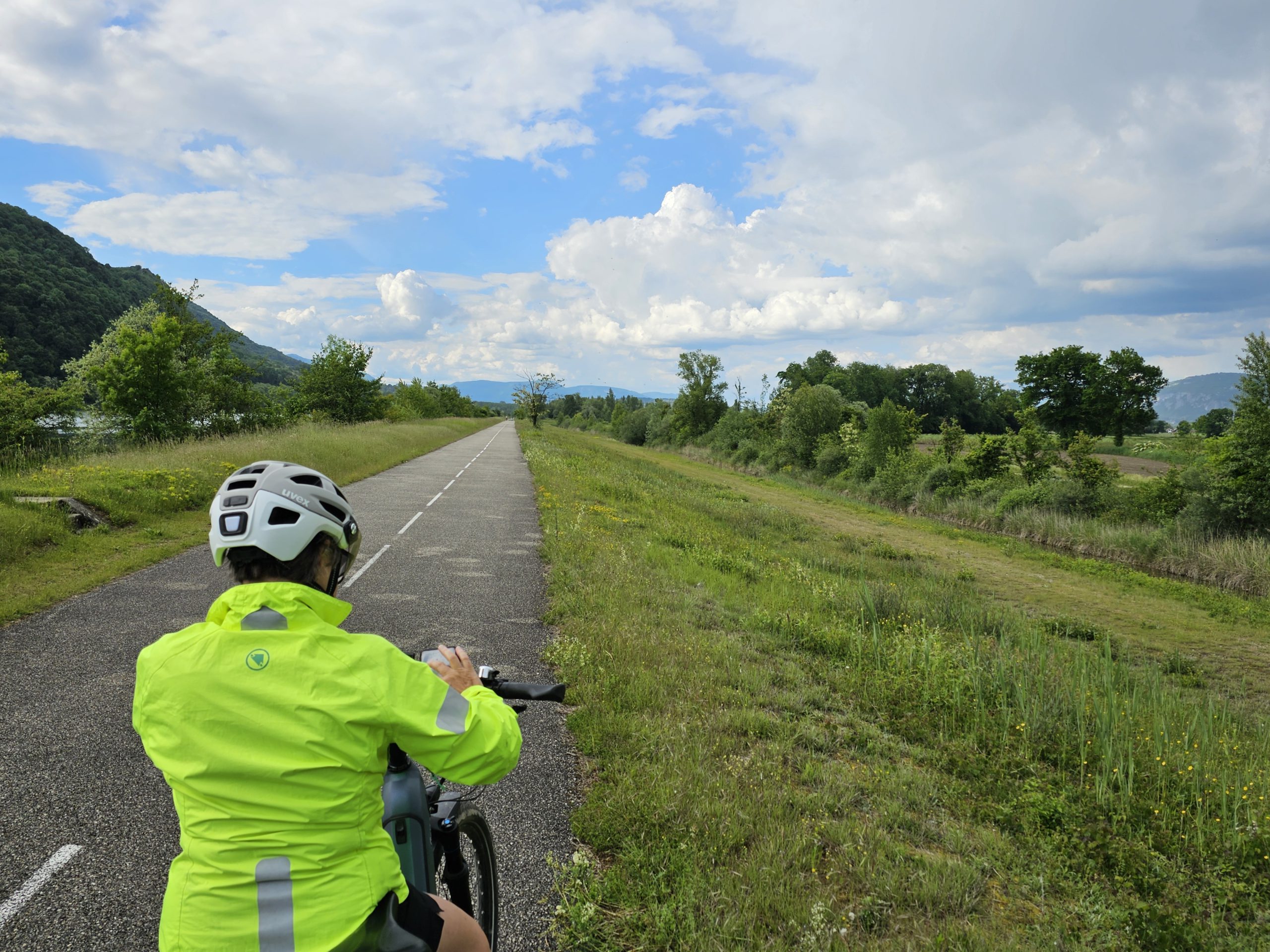 Noch während wir uns heute beim Abfahren fragten, wann es wohl heute zu regnen beginnt, fielen die ersten Tröpfchen. Zum Glück blieb es bei dunklen Wolken und vereinzelten Tropfen. Nach dem Mittag riss die Wolkendecke auf und der blaue Himmel wurde sichtbar. Sobald die Sonne scheint, wird es sofort wärmer und wir konnten bequem ohne Jacke weiterradeln.