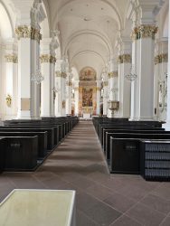 Beim Spaziergang durch die Altsstadt zur Talstation der Bergbahn entdeckten wir die Jesuitenkirche im barocken Baustil. Sie wirkt sehr elegant und schlicht, weil sie nicht überfüllt ist mit Schnörkeln, Statuen und Altären aus allen Zeiten. Besonders gelungen finde ich den neuen Alter und den Weihwasserstein. Beide sind aus weissem Marmor kompakt und sehr einfach in der Form. Sie passen sich wunderbar in das Gesamtbild ein und verbinden so Neues mit Altem.
