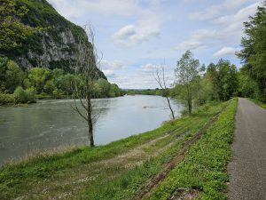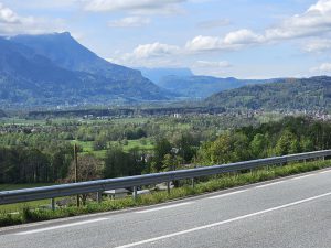 Vom Ende des Sees führte die Veloroute entlang der Dorfstrassen – immer mit speziell gekennzeichnet – und durch Quartiere bis es dann von Chambéry aus aufwärts ging. Gemäss grobem Überblick hatten wir eine Nebenstrasse durch den Wald erwartet… Bei genauerem Hinsehen entpuppte diese sich als Passstrasse mit mehr oder weniger Verkehr.