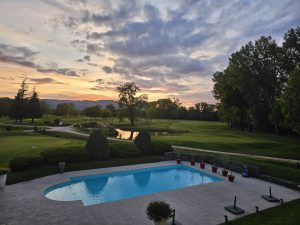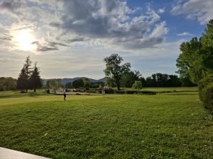Und schon bald kam die Brücke in Sicht, die wir überquerten, um zum Golfhotel in St. Quientin sur Isère zu gelangen, wo wir für diese Nacht unser Zuhause fanden. Das Hotel liegt etwas ausserhalb des Dorfes in Mitten von Wiese, Wald und Baumnussbäumen – und natürlich des Golfplatzes.