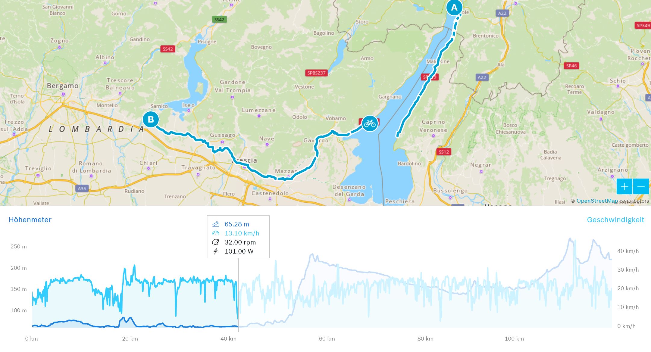 Im Hotel wurden wir gewarnt, dass auf der Strecke nach Peschiera viel Verkehr sei. So schlimm war es aus unserer Sicht gar nicht. Zu Beginn einige Galerien und danach immer dem Ufer entlang. In Torri wartete die Fähre grad auf uns und führte uns nach Toscolano-Maderno. Dadurch konnten wir uns einige Kilometer sparen.